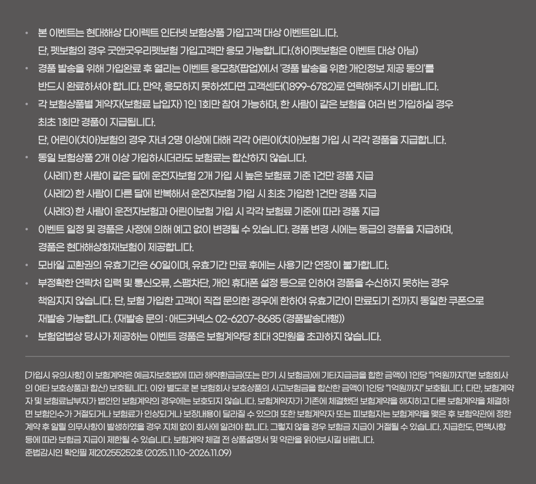 - 이벤트 일정 및 경품은 사정에 의해 예고 없이 변경될 수 있습니다. 경품 변경 시에는 동급의 경품을 지급하며, 경품은 현대해상화재보험이 제공합니다.