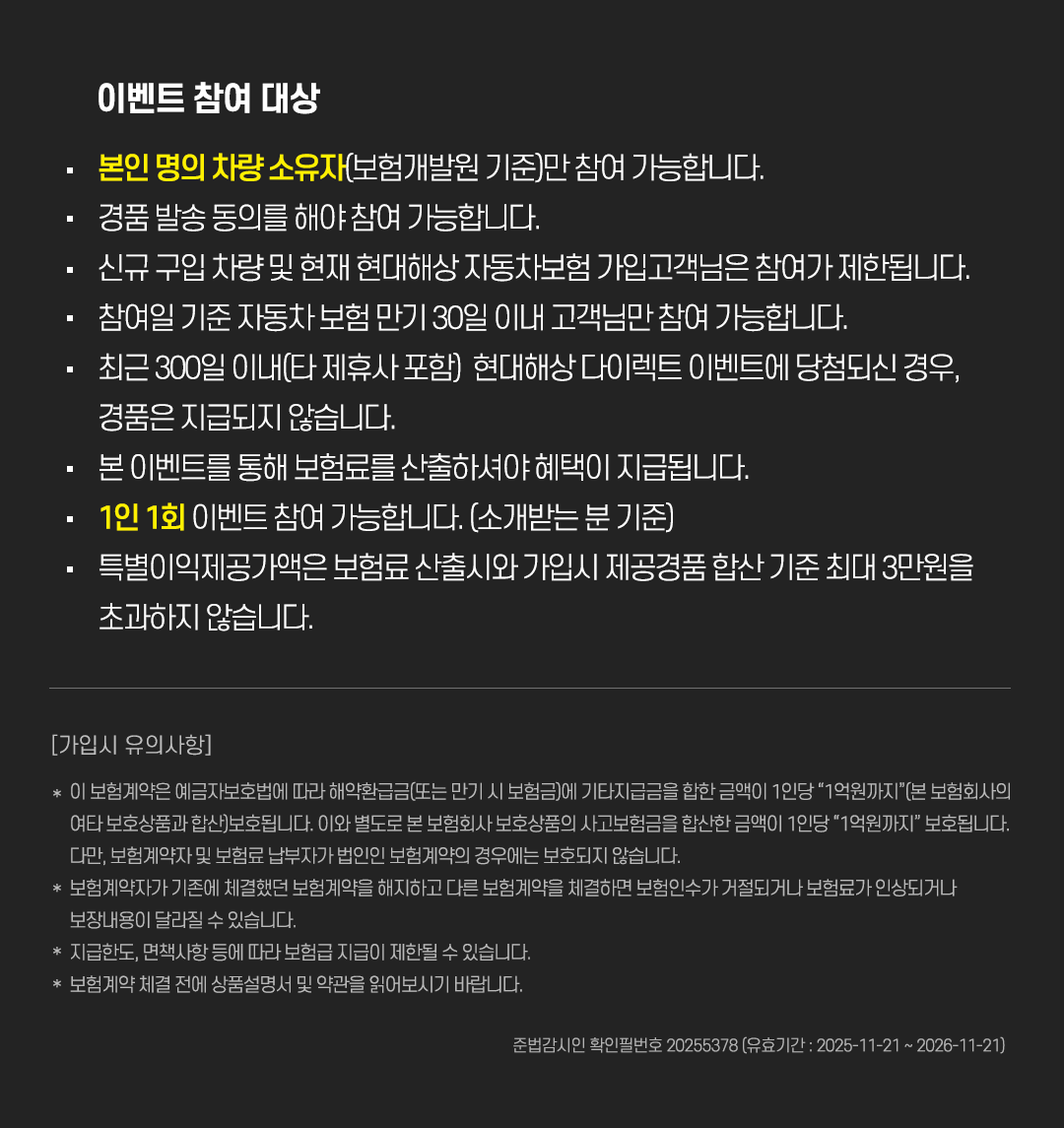 - 최근 300일 이내(타 제휴사 포함) 현대해상 다이렉트 이벤트에 당첨되신 경우, 경품은 지급되지 않습니다.